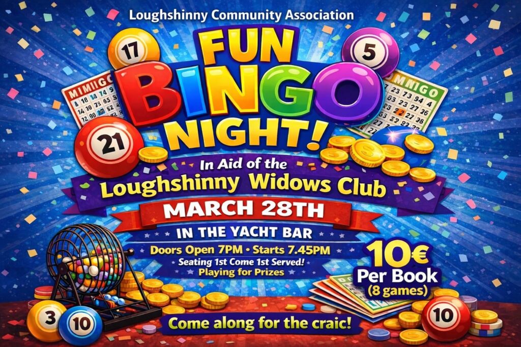 Fun Bingo Night in aid of Loughshinny Widows Club March 28th in The Yacht Bar – Doors open at 7pm and starts at 7.45pm!